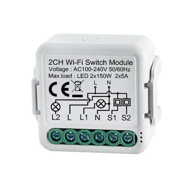 This smart Wi-Fi relay switch module can be installed behind exising regular switches, in a distribution box or in a ceiling fitting. Then you will enable to turn two or two groups of lights on/off the lights seperatively or at the same time by using your smartphone from anywhere.